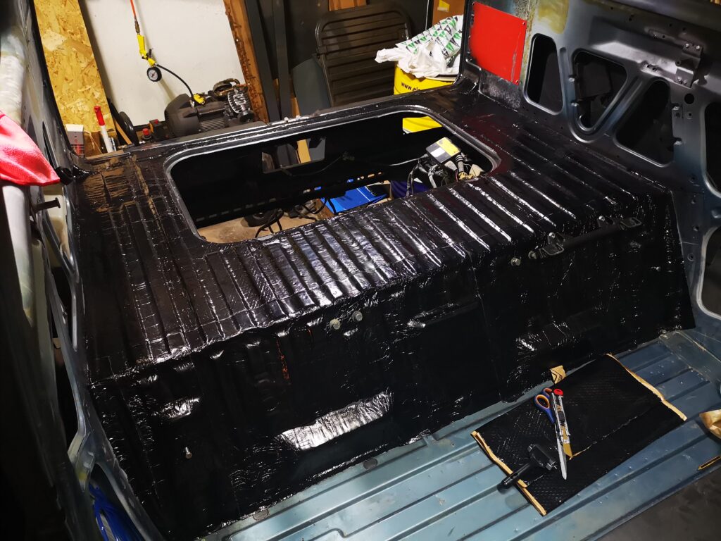 Además de aislar térmicamente la furgoneta con kaiflex, para ciertas zonas, como son el suelo y la zona del motor he usado un aislamiento acústico para furgoneta