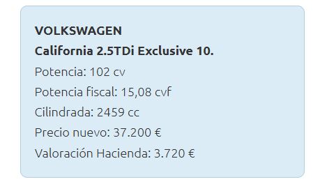 1- El Valor Venal (tu peor pesadilla): Es el valor que tiene tu furgoneta basándose estricta y únicamente en su antigüedad, según unas tablas oficiales que maneja Hacienda. Yo he comprobado el valor que tiene una Volkswagen T4 California Exclusive en 2026 y estos son los datos:
