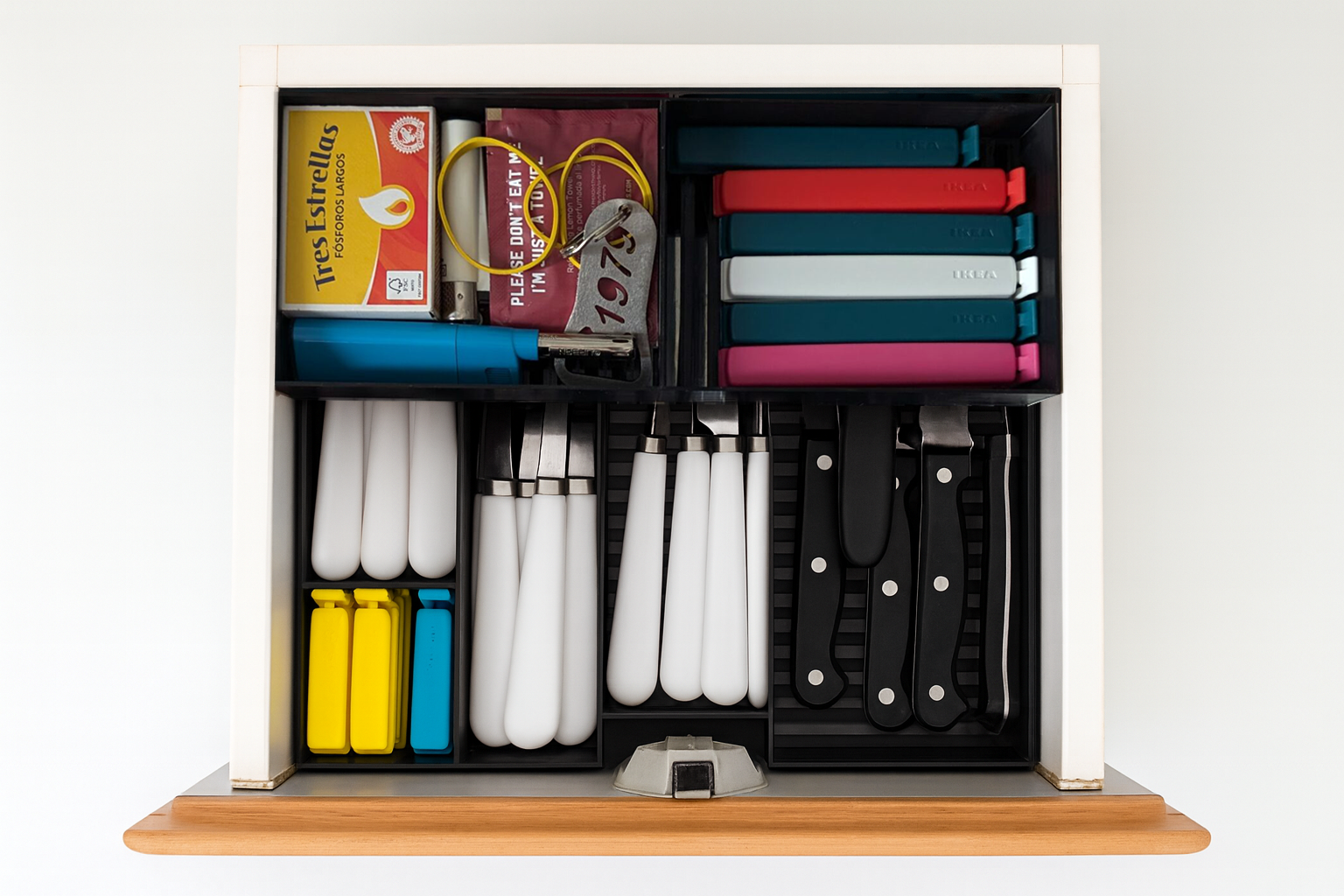 Se compone de dos bandejas de plástico, una inferior con cuatro huecos de diferentes tamaños ideal para guardar los cubiertos, tijeras, abrebotellas o las imprescindibles pinzas de ikea y una bandeja superior deslizante para ganar espacio en altura pensado para guardar otros utensilios.